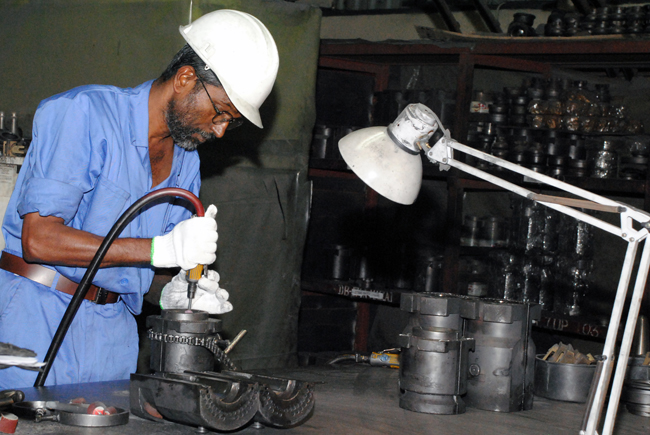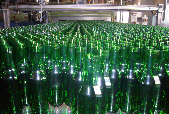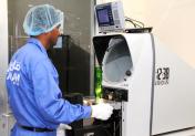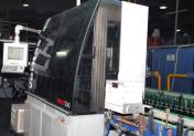The role of the cold end inspection machine is to inspect the containers for defects , package the containers for shipment and label the containers. Glass containers are 100% inspected by automatic machines also by visual inspection, inspect every container for a variety of faults. Typical faults include checks inspection like finish, neck, shoulder, body, heel area and base, dip inspection, wall thickness , dimensional inspection, side wall inspection , stress detection, sealing surface & base inspection, Mould number reader. In addition to rejecting faulty containers, inspection equipment gathers statistical information and relays it to the forming machine operators in the hot end. Computer systems collect fault information to the mould that produced the container. Operators carry out a range of checks manually on samples of containers, usually visual and dimensional checks.